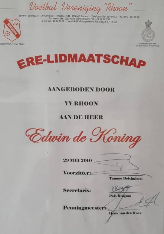v.v. Rhoon heeft een aantal leden benoemd tot ereleden. Op bijgaande foto van 2017, met de benoeming van John Koster, is deze foto gemaakt met