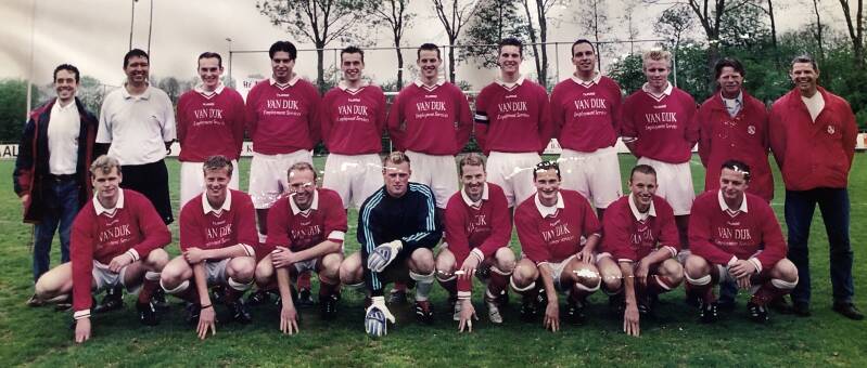 Staand v.l.n.r. Hans de Doelder (Verzorger) - Bert Habermehl (grensrechter) - Edwin de Rooij - Daan den Hoed - Darek Koster - Alex 't Hart - Jeroen Dol - Patrick Olijhoeck - Tim Wendrich - Jan Roest (leider) - Edwin de Koning (trainer)